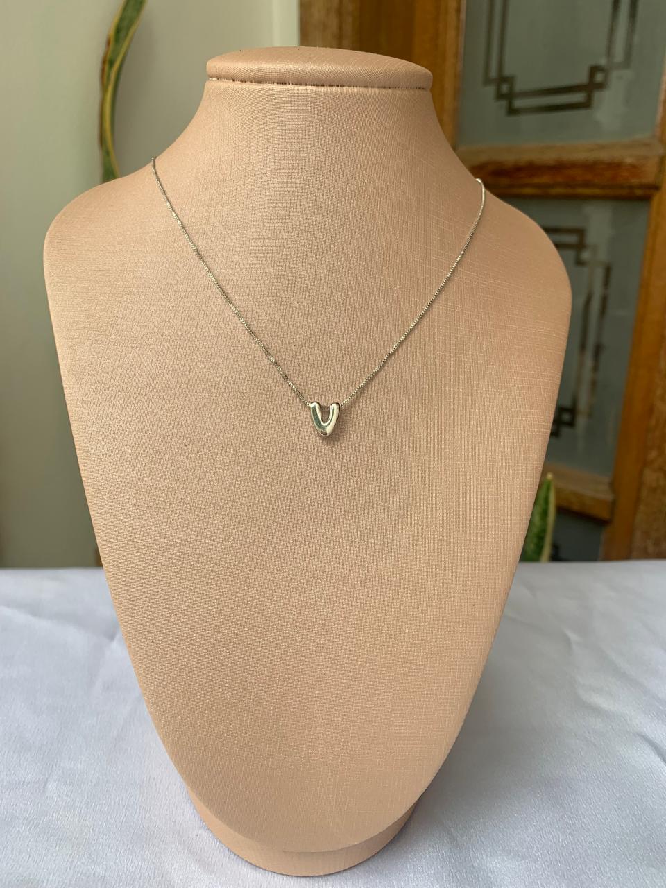 Gargantilha banhada no ródio branco (metal nobre) com corrente veneziana, com pingente da letra V.