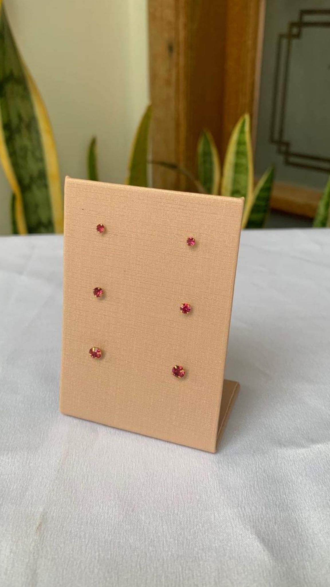 Trio de pequenos brincos, com tamanhos diferentes, banhados em ouro com zircônia vermelha.